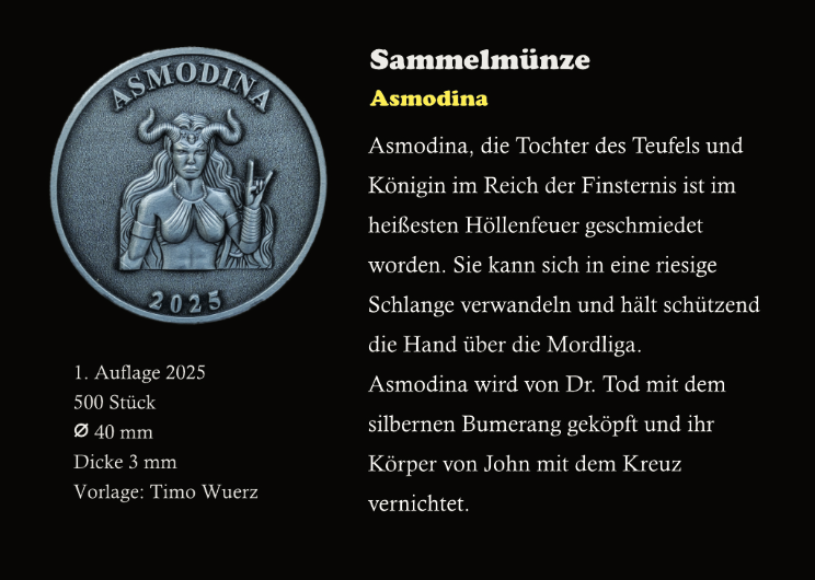 - Asmodina, die Tochter des Teufels und Königin im Reich der Finsternis ist im heißesten Höllenfeuer geschmiedet worden. Sie kann sich in eine riesige Schlange verwandeln und hält schützend die Hand über die Mordliga. Asmodina wird von Dr. Tod mit dem silbernen Bumerang geköpft und ihr Körper von John mit dem Kreuz vernichtet.